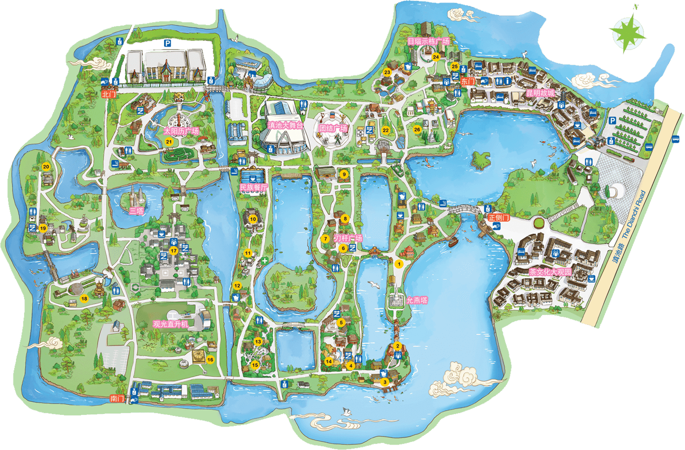 佤族人口約36萬,主要聚居在云南省瀾滄江南段以西的阿佤山區(qū)。佤族寨位于“翠漪洲”東南角。寨內分布有茅草頂的干欄式建筑群、牛頭廣場、神靈廣場、司崗里石雕以及糧倉等。牛頭廣場是佤族古老的剽牛活動場所,場正中的牛角為佤族的寨樁,廣場前的兩個石人分別為佤族的男性和女性祖先。神靈廣場表現了佤族萬物有靈、靈魂不死的自然崇拜觀念。場中兩個石人雕像分別為佤族最崇拜的“木依吉”和“阿依娥”。佤族木鼓舞節(jié)拍鮮明強烈,...